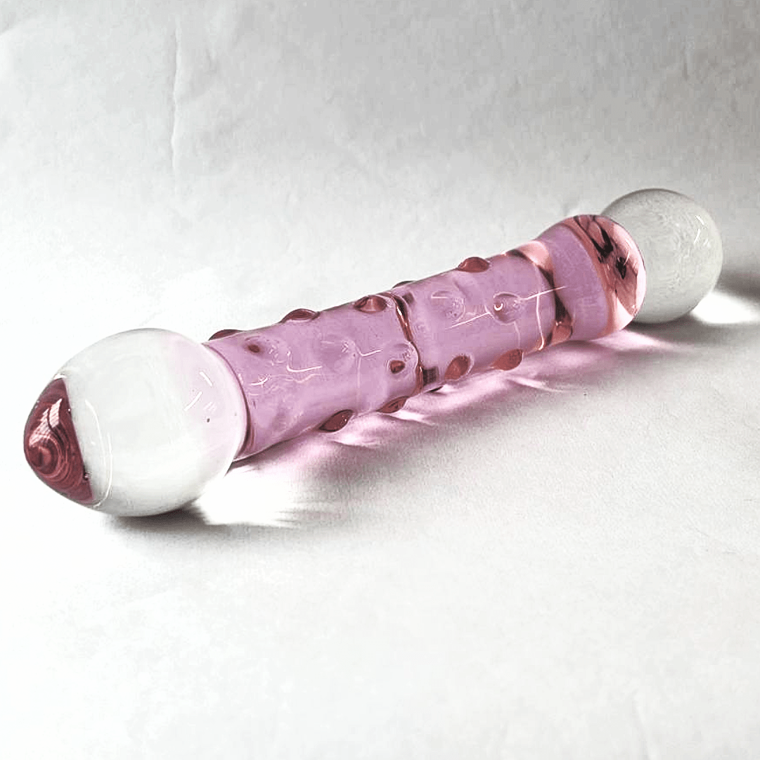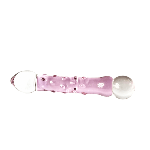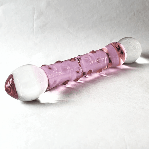 The Pink Textured G-Spot Glass Dildo is 8.5 inches long and features two distinct ends. One tip is gently tapered for comfortable insertion. The other end is round and smooth - perfect for 'popping' sensations when stroked in and out.
